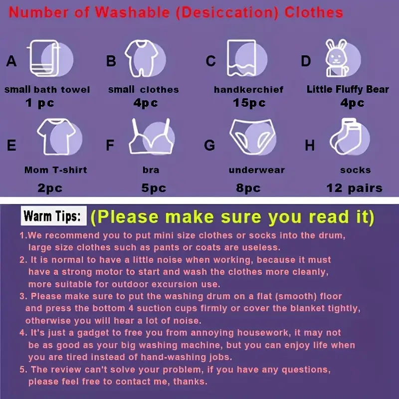• Powerful Decontamination: This mini washing machine provides all-round imitation hand scrubbing, suitable washing speed, and strong decontamination. With blue light, it is very suitable for washing small clothes such as baby clothes, underwear or socks, keeping you and your family healthy! 【Not recommended for large clothes】